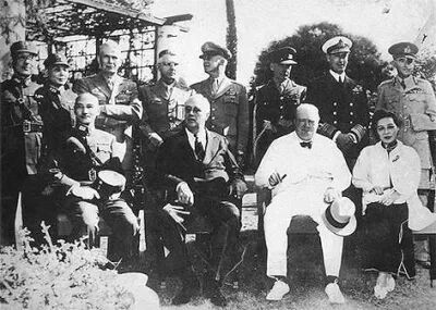 ▲(前排左起)蒋介石、罗斯福、丘吉尔、宋美龄在开罗会议的合影